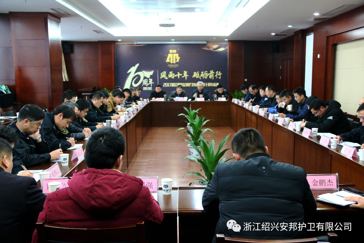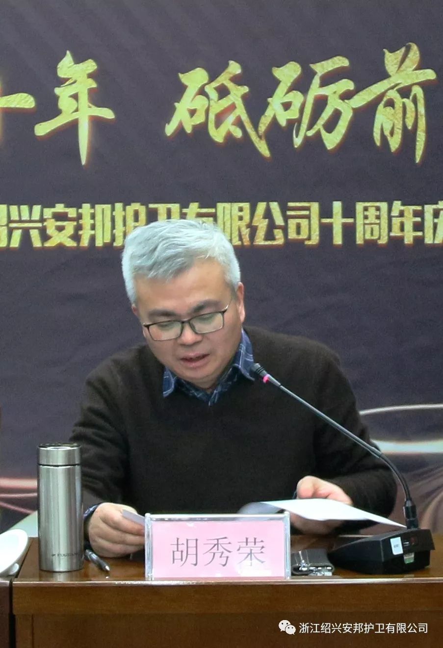 最后,公司党委书记、董事长、总经理胡秀荣回顾并总结了公司十年来的发展历程,公司在制度建设、人才队伍建设、基础设施建设与完善、服务保障、市场拓展、安全管理等方面取得的进步。近几年,公司在做好传统守押业务服务的同时,积极向科技类外拓业务发展,社会效益和经济效益实现了双丰收。他指出,今后公司要坚持转型升级为目标,继续以“两个中心”为发展战略,通过“质量固本、深耕外拓和引才强企”三条路径,打造出一个安全强、队伍健、效益佳、品牌响的绍兴安邦。