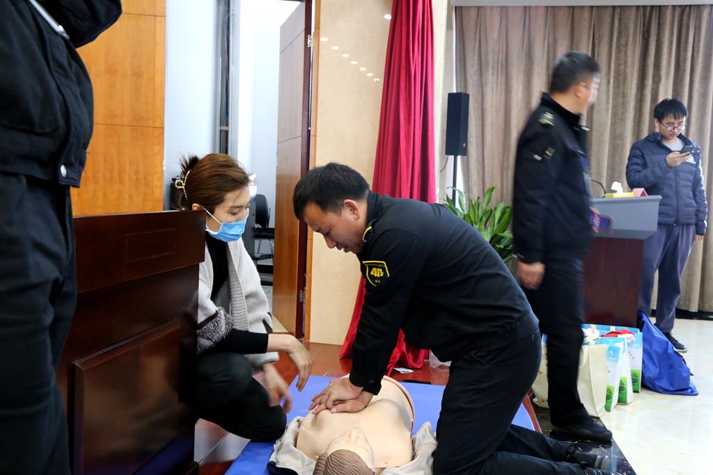 培训分为授课和考试两部分。培训老师为大家详细讲解了水、火、电事故的急救处理和心肺复苏、气道梗塞急救、创伤救护、AED(自动体外除颤器)使用与操作,并通过生动具体的实例和现场演示,让受训人员迅速掌握知识要点。培训老师的专业、生动的讲解和精湛的救护技术深深地吸引了在场的每一位学员。