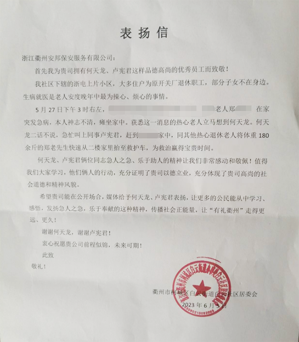 6月8日下午,衢州安邦保安公司收到某驻点单位发来的表扬信,信中对何天龙、卢宪君两位保安员乐于奉献的精神提出表扬和肯定。