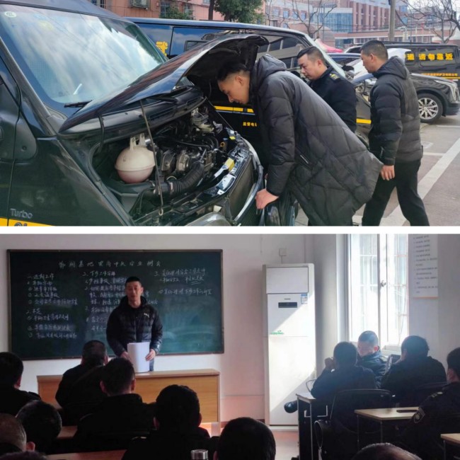 一、现场巡查排隐患。基地主任吴波带领副主任蔡亚伟等人陆续前往各中队驻点场所排查行车隐患。检查内容包括车辆性能是否正常、车容车貌是否整洁等。