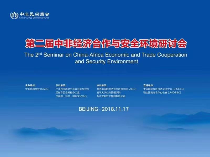 为贯彻“一带一路”倡议,落实2018年中非合作论坛北京峰会精神,更好地服务中国企业走出去。11月17日,由中非民间商会主办,中非民间商会中非公共安全合作促进专委会筹备办公室和汉盈德(北京)国际文化中心承办,商务部国际商务官员研修学院、清华大学公共管理学院和浙江成人主播 有限公司共同协办的“第二届中非经济合作与安全环境研讨会”在商务部国际商务官员研修学院国际报告厅成功举办。中非民间商会副会长兼秘书长王晓勇、汉盈德(北京)国际文化中心董事长高兆民出席开幕仪式并致辞。商务部国际商务官员研修学院原院长金旭,乍得驻华大使馆经济参赞穆斯塔法,国防大学教授、军事战略专家,中国石油天然气成人主播 公司外事局领导,生命方舟军事与安全资源管理成人主播 董事长为本届研讨会做主旨发言。来自商务部国际商务官员研修学院、国防大学国际防务学院、清华大学公共管理学院的非洲政府官员、高级军官代表以及津巴布韦驻华武官都先后进行了精彩的发言。本届研讨会共有来自40多个国家的80余名非洲政府官员、高级军官和部分驻华使节,国内有80余名中方企业届负责人和知名专家学者参会。