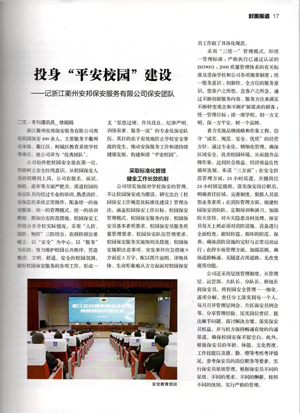 浙江衢州安邦保安服务有限公司现有校园保安400余人,主要服务于衢州市本级、衢江区、柯城区教育系统学校等单位,被公司评为“优秀团队”。