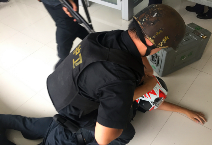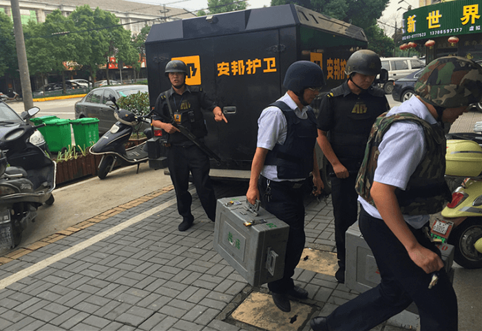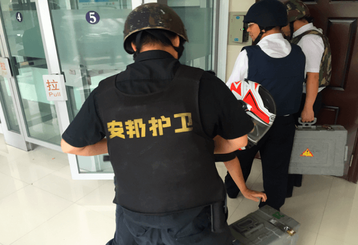 演练模拟场景当日下午15点,安邦公司运钞车到达海宁农商银行盐官支行丰兴自助银行执行加钞任务,当海宁农商银行加钞员提着款箱在押运员的护卫下,行至ATM机加钞间刚要打开防盗门时,突然窜出一名头戴摩托车头盔的男子,快速向加钞员冲过来,试图抢夺加钞员手中的款箱。被反应敏捷的押运员侧身一挡,阻止了歹徒抢夺款箱的意图,歹徒见抢夺未成,恼羞成怒,从腰间拔出一把匕首,押运员见状勇敢上前与持刀歹徒展开搏斗,车长第一时间用对讲机向指挥室和队长报告情况,同时驾驶员拉响车内警报,后持刀歹徒被制服并移交给前来处警的民警。