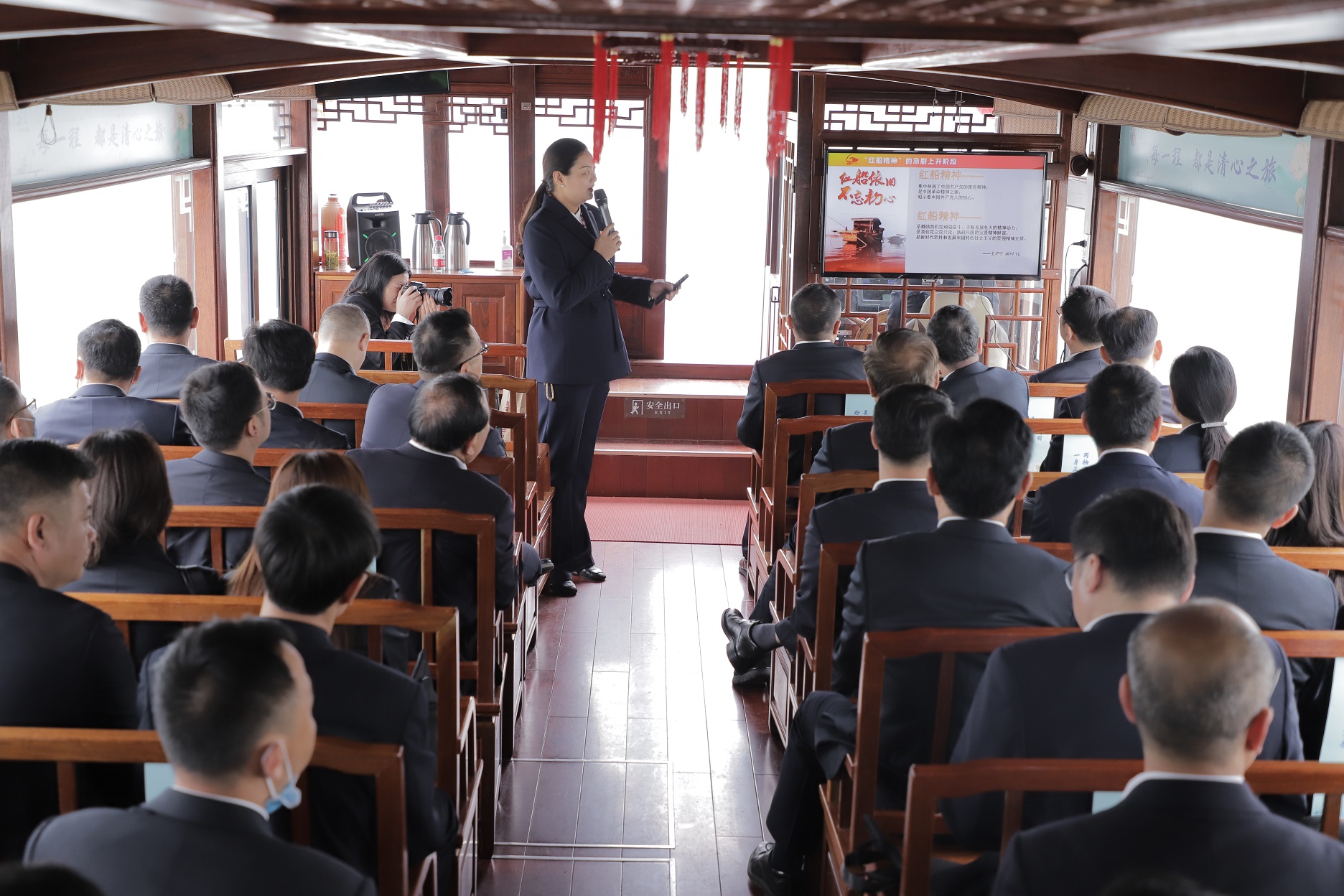 在南湖的画舫上,党员们聆听了浙江红船干部学院讲师以《弘扬红船精神 走在时代前列》为主题的水上党课。“红船劈波行,精神聚人心”。红船精神代表和昭示的是时代高度、发展方向和奋进明灯,是铸就在中华儿女心中的永不褪色的精神丰碑。