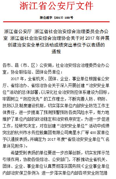 近日,嘉兴安邦公司被省综治委、省公安厅评为浙江省省级治安先进单位,这是嘉兴安邦公司连续第三年获此殊荣,也是全市唯一一家安保企业受到表彰。