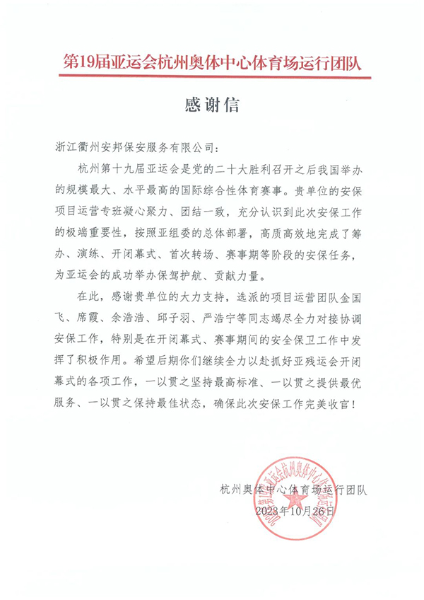2023年10月27日,浙江衢州安邦保安服务有限公司收到一封来自第19届亚运会杭州奥体中心体育场运行团队的感谢信,信中对公司安保项目运营专班高质量完成筹办、演练、开闭幕式、首次转场、赛事期等阶段的安保任务做出的贡献表示肯定和感谢,尤其是项目运营团队中的金国飞、席霞、余浩浩、邱子羽、严浩宁等同志竭尽全力对接协调安保工作发挥了积极作用。