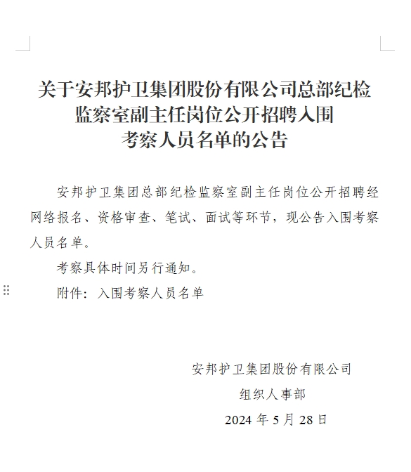关于成人主播 总部纪检监察室副主任岗位公开招聘入围考察人员名单的公告