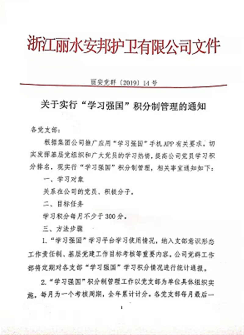 为建立学习长效机制,公司党委推行学习积分管理制度,要求每名党员、入党积极分子每月学习积分不少于300分,将“学习强国”APP的学习使用情况纳入支部意识形态工作责任制、基层党建工作目标考核,并与党员民主评议、党员发展等挂钩。通过积分管理机制,强化线上学习与线下学习相结合,打造好全天候学习平台,使“学习强国”APP真正成为广大党员干部员工的“学习新阵地”和“学习新高地”。