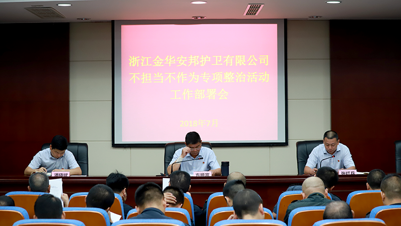 7月16日上午,金华安邦公司召开“不担当不作为”专项整治行动动员部署会,进一步提振公司干部队伍士气,激发敢拼敢争的干事创业热情,当好新时代金华安邦答卷人,营造公司全体党员干部敢担当、有作为的浓厚氛围。公司领导班子、总部全体人员及各大(中)队主要负责人参加。