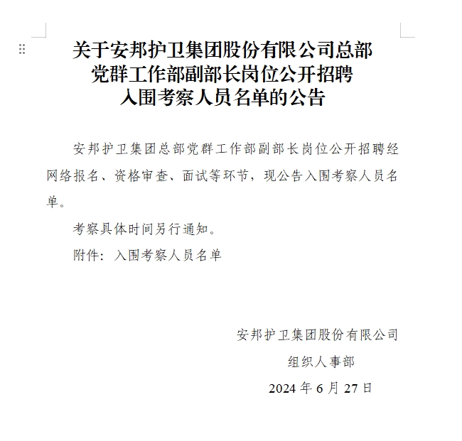 关于成人主播 总部党群工作部副部长岗位公开招聘入围考察人员名单的公告