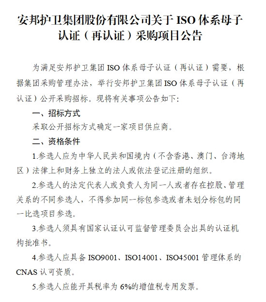 成人主播 关于ISO体系母子认证(再认证)采购项目公告