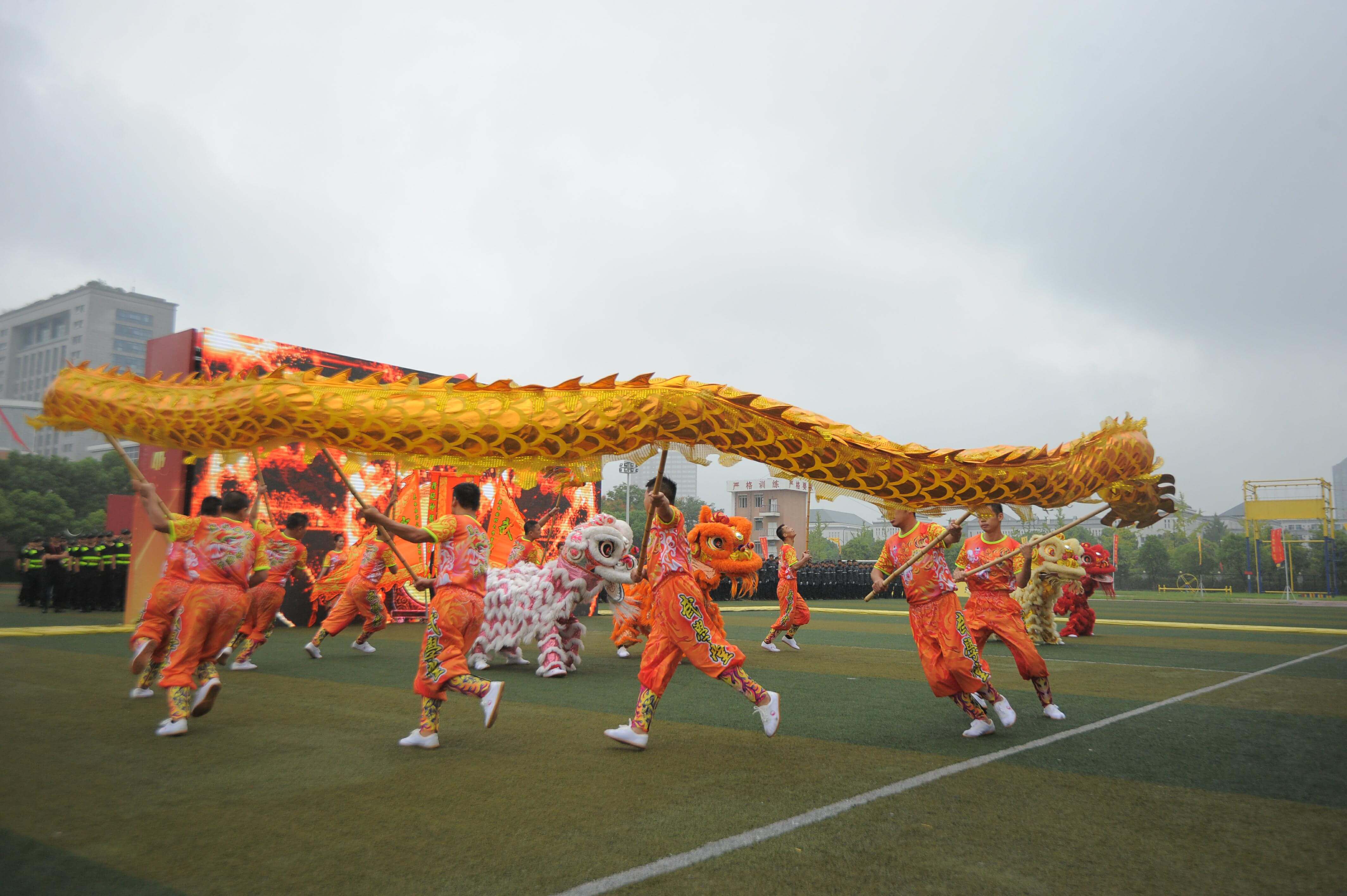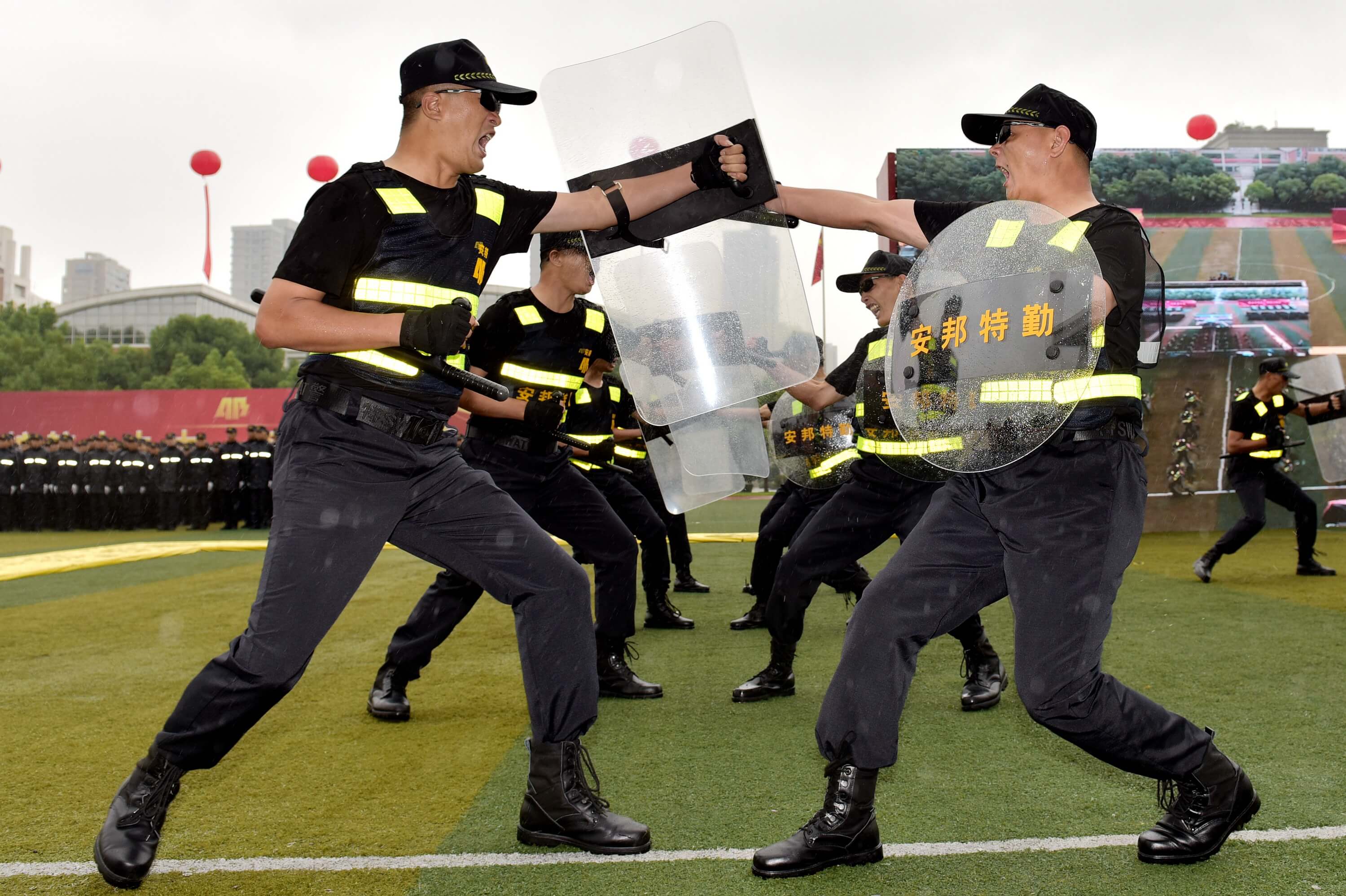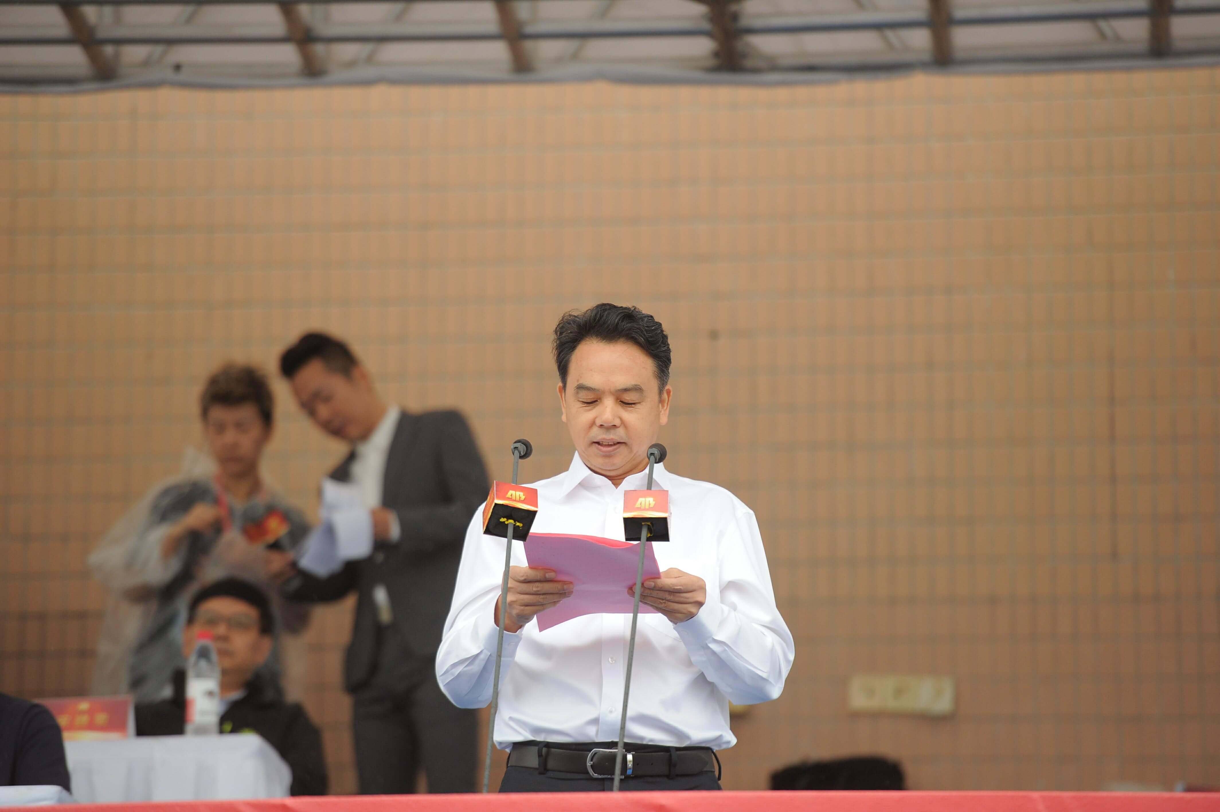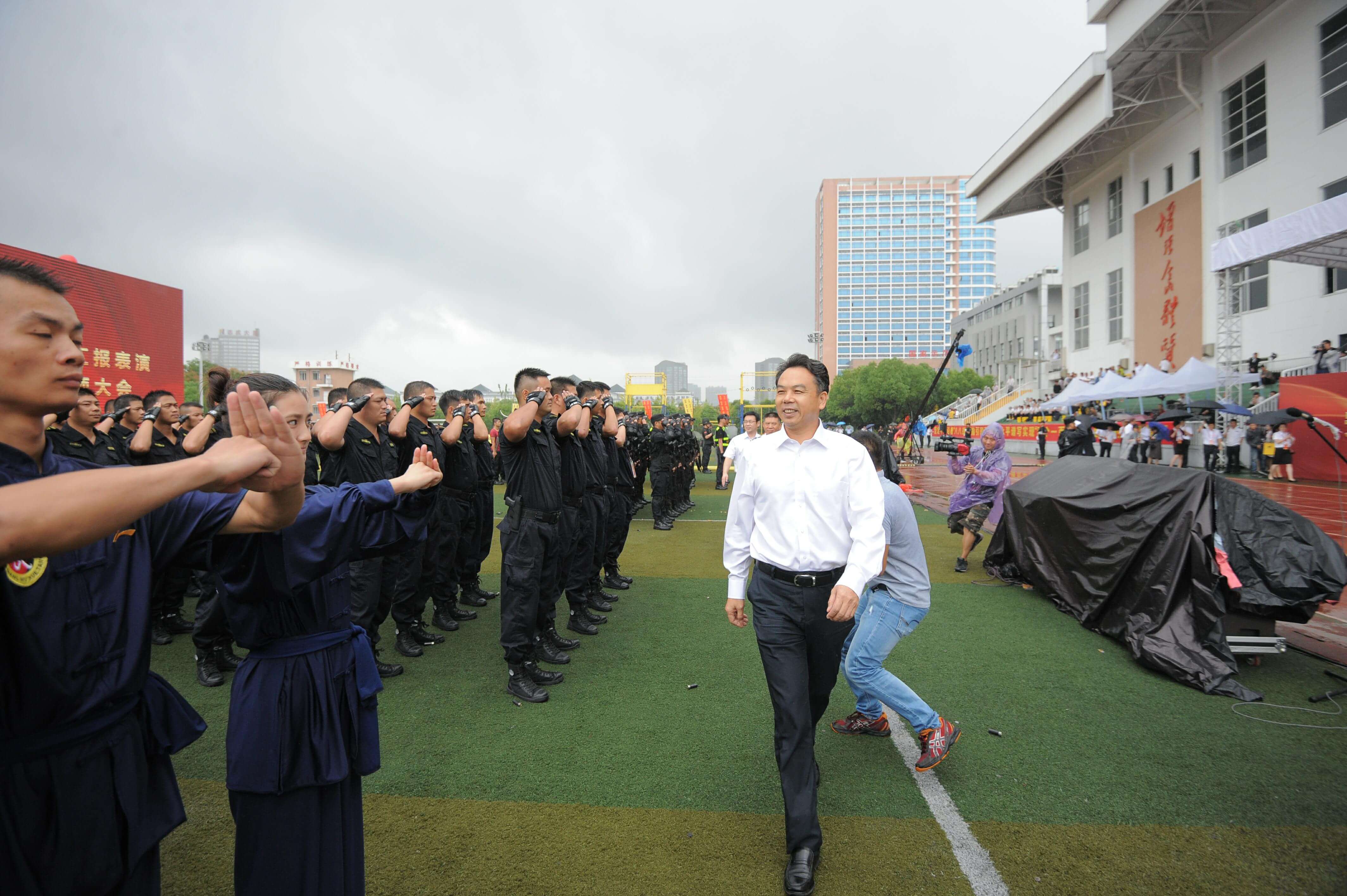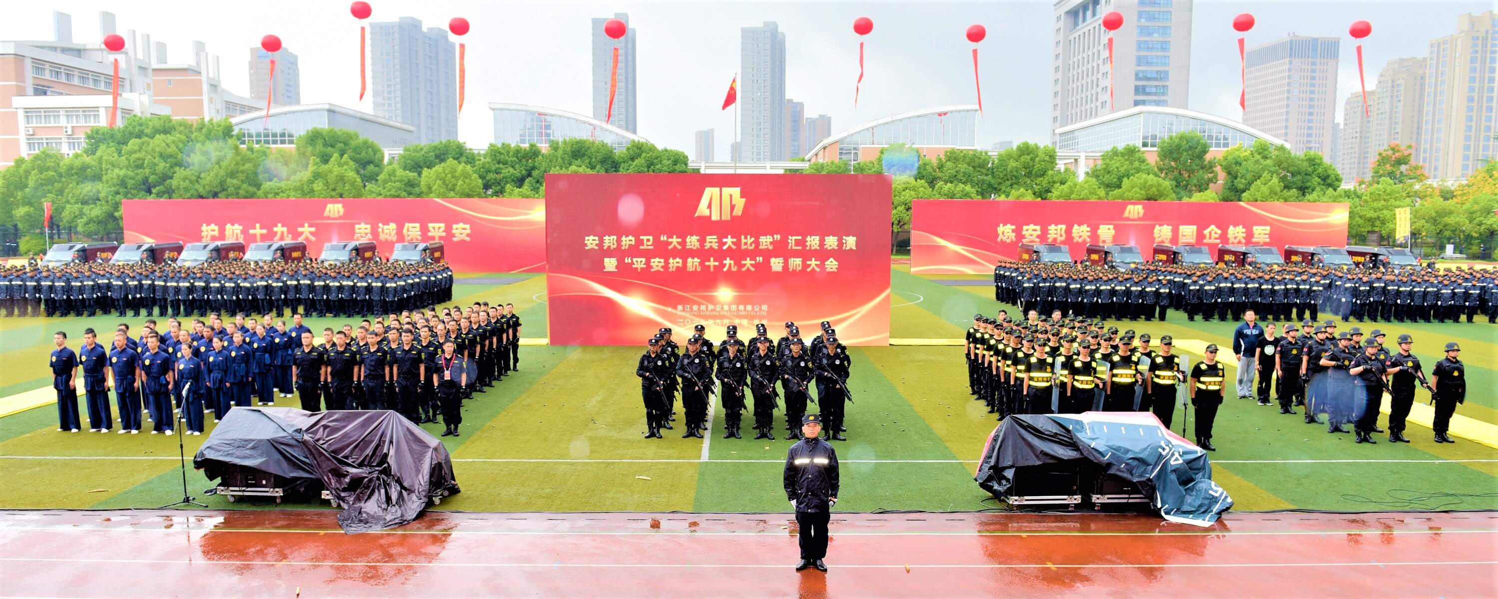 誓师大会在疾风劲雨中举行。现场由成人主播 各子公司共1000余名员工代表、10余辆押运车组成气势雄伟的誓师方阵和装备方队,向来宾展示安邦风采。