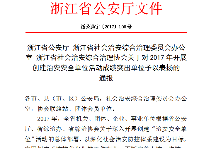 有限公司被评为2017年度“省级治安安全单位”。公司将继续以深化社会治安防控体系建设为目标,牢固树立“防控优先”的工作理念,不断完善人防、物防、技防以及制度建设机制,切实落实公司内部安全防范工作主体责任,进一步提高预测预警预防各类风险水平,维护好公司内部的政治稳定和治安秩序安定。为深化“平安浙江”“平安金华”建设、构建和谐社会做出新的更大的贡献。(办公室)
