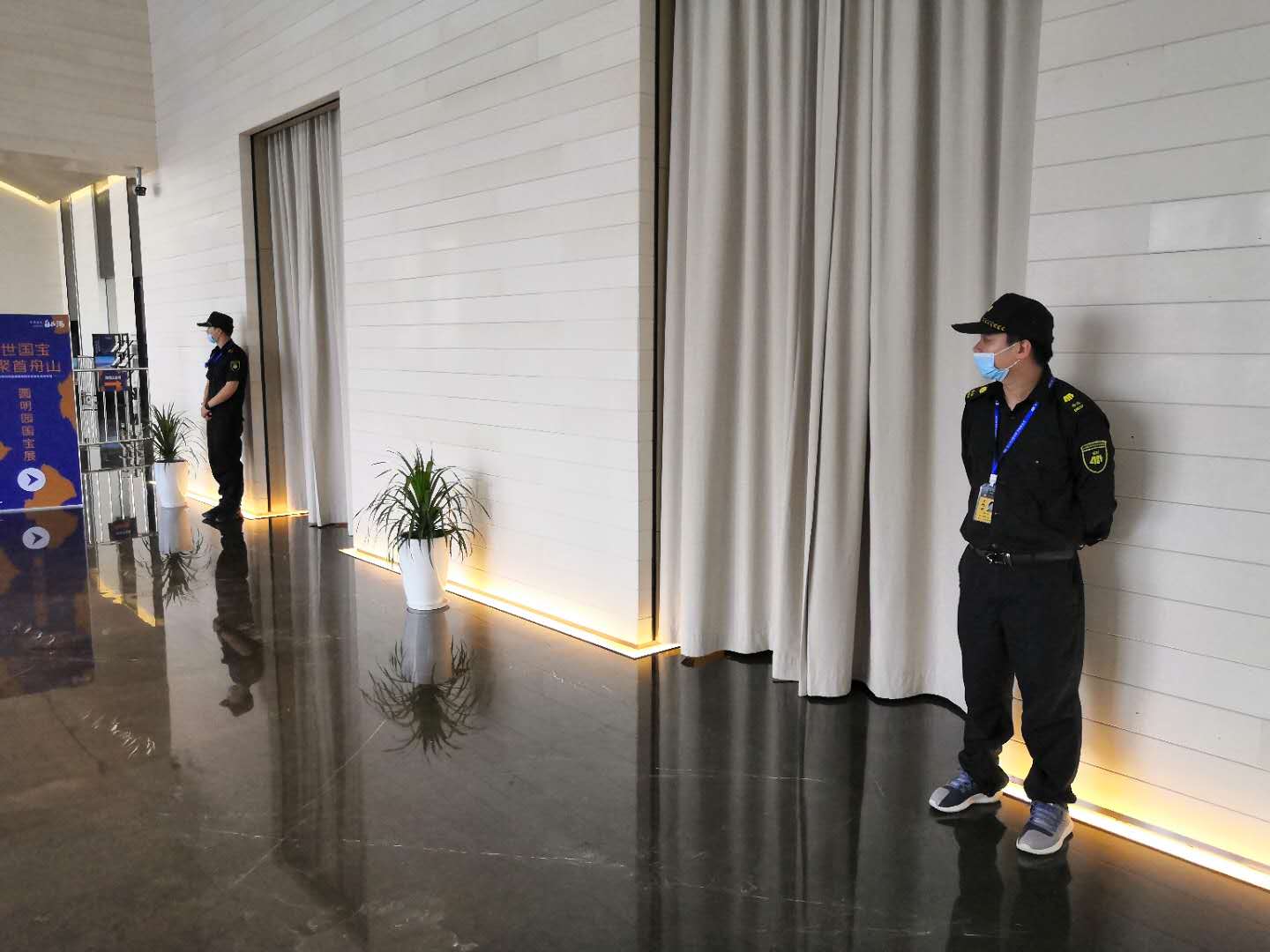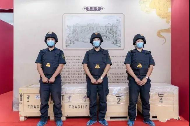 9月26日,国宝从北京抵达舟山展览地点——保利·自在海生活美学馆,公司派遣了8名安保人员前去守护。