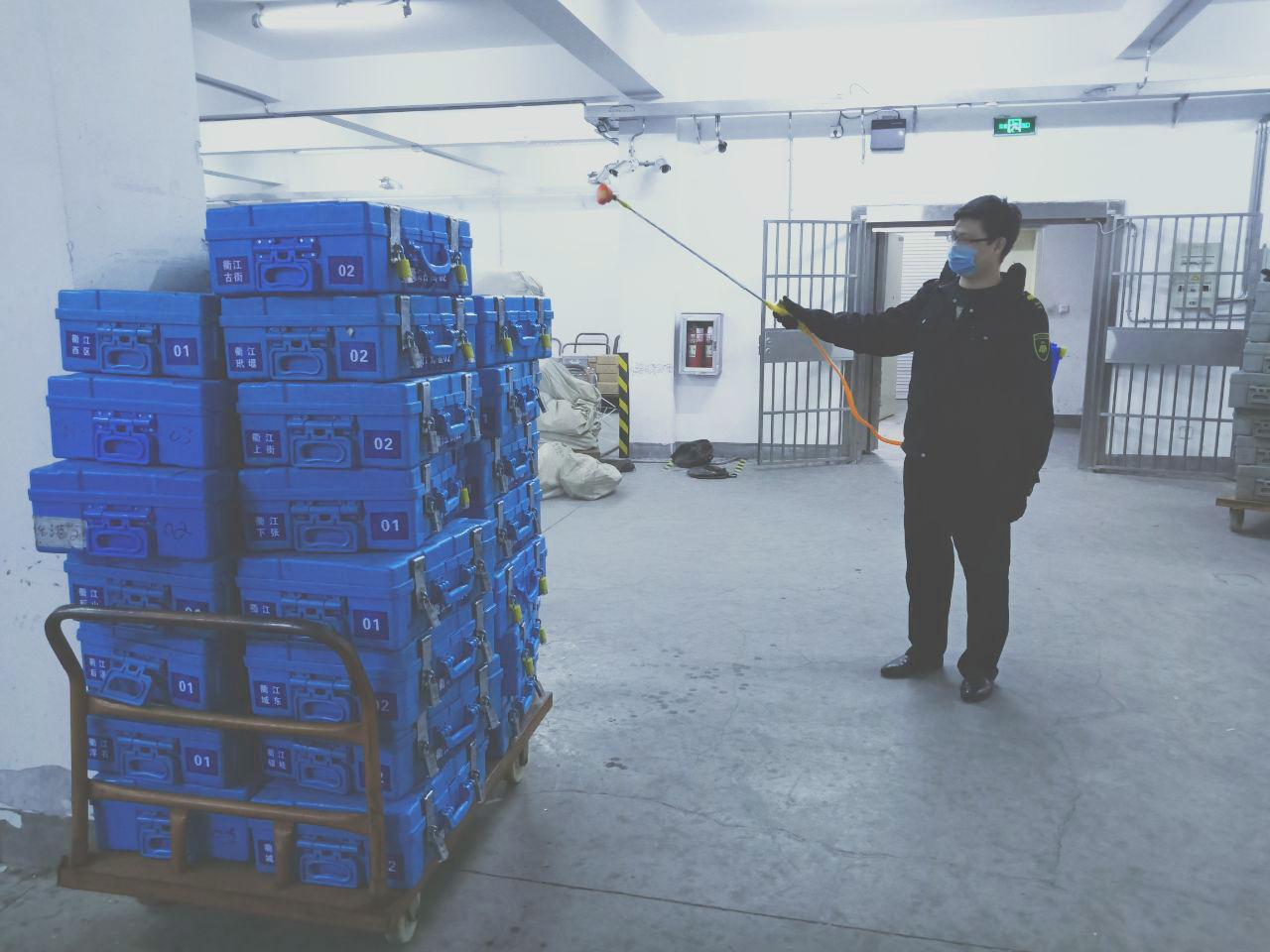 公司金库是款箱出库的第一道关和入库的最后一道关,公司确保每一位库管人员体温正常、持绿码上岗,对库区、款箱、押运车、办公用品等全面消毒不留死角。协管员做好银行押运物品的调配,确保押运物品安全进出库,保证款箱安全。