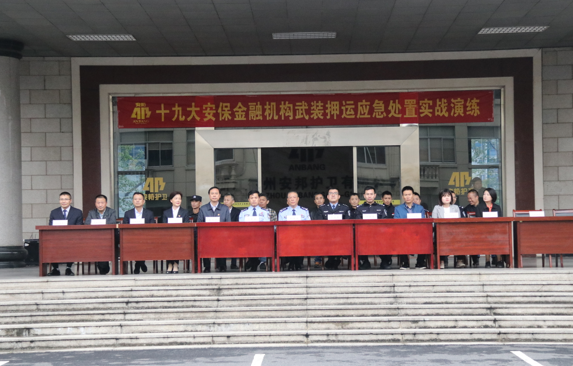 10月16日下午,十九大安保金融机构武装押运防抢应急处置演练在公司大院举行,本次演练模拟某银行网点装卸款箱时防抢应急处置现场,市公安局党委委员彭海生,市局治安支队支队长范庆军、副支队长池世春,市局警卫处政委陈森建,特警支队副支队长邵坚胜、指挥中心副主任徐敏及各分局治安大队大队长、教导员,衢州安邦公司党委班子成员,市直银行业各金融机构领导、安保负责人观摩了演练。