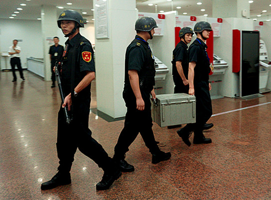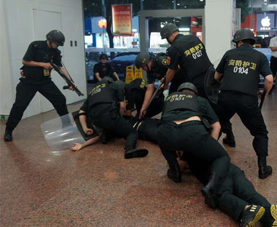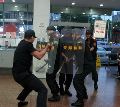 押运员当即举护盾防卫、车长举枪震慑并立即向指挥中心报警,两人与歹徒形成对峙;同时,二名交接员快速转移款箱。银行保安员、大堂经理迅速组织引导疏散客户;银行网点工作人员立即按下紧急报警按钮。
