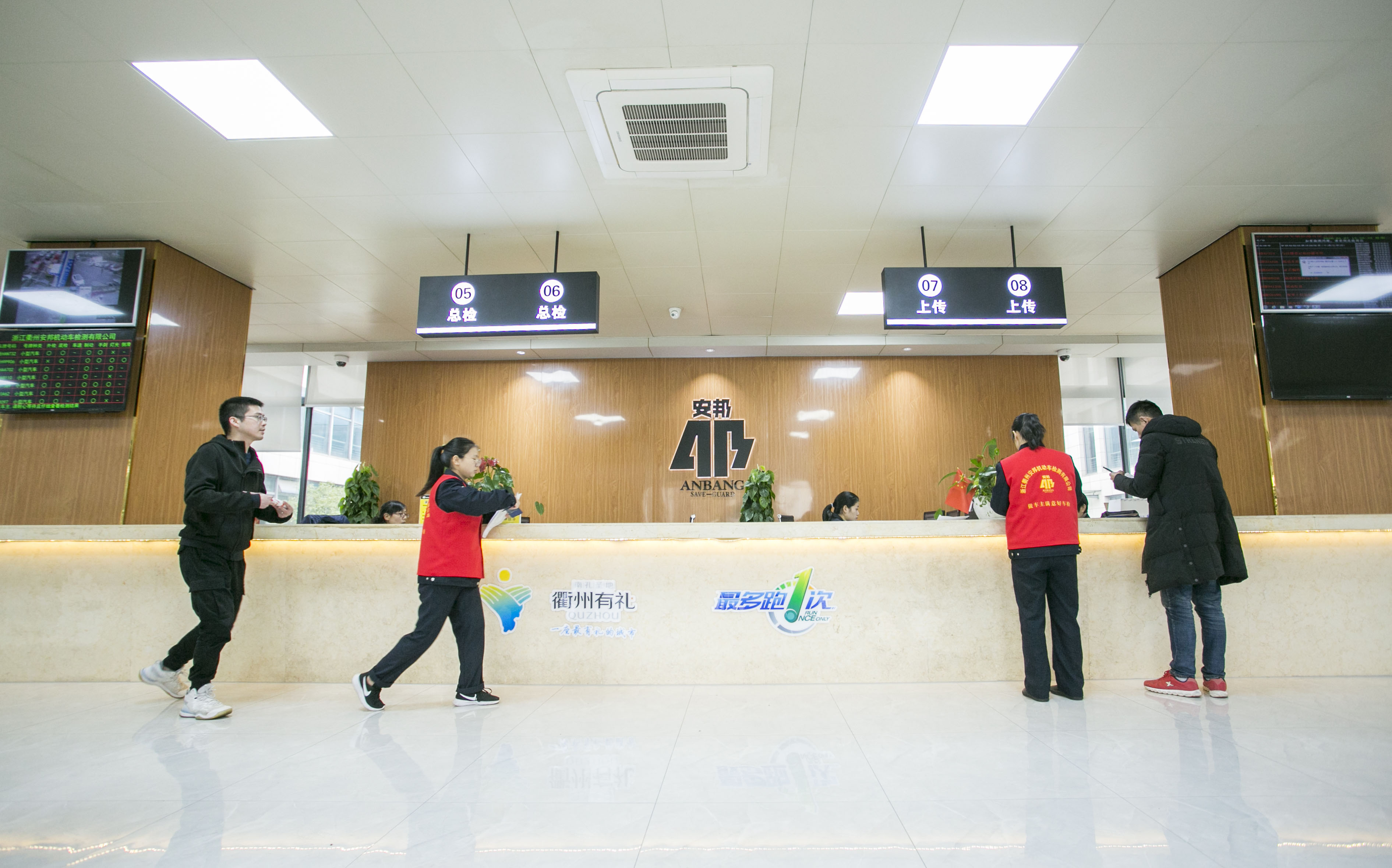 12月17日起,安邦公司投入大量资金提升改造各类硬件设施,对原办事大厅进行全面的升级改造,先后对地面、墙面进行翻新,对车主休息区进行扩建,重新购置了沙发、茶几,以“最多跑一次”、“衢州有礼”、“优质服务”等元素为主题,对办事大厅的服务文化进行全面升级,休息区配套齐全的便民服务设施,包括提供共享充电宝、共享按摩椅、自助售货机、自助业务查询机等;对检测场地重新规划,细化待检区、检测区、复检区、交车区、休息区、办事区和停车区等功能区块,在检测车间入口及出口处安装智能感应道闸,落实封闭管理,实现检测“人车分离”,规范场地秩序,同时对检测车间顶棚进行全面翻新,对车间地面重新规划各类引导指示牌重新规划,让群众办事更加一目了然。