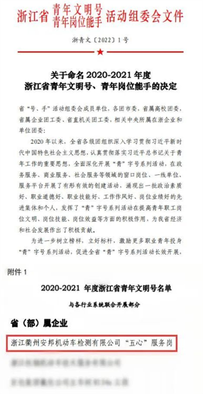 4月18日,浙江省“青年文明号、青年岗位能手”活动组委会发布《关于命名2020-2021年度浙江省青年文明号、青年岗位能手的决定》,命名全省574家集体为2020-2021年度浙江省青年文明号,认定230人为2020-2021年度浙江省青年岗位能手。其中,浙江衢州安邦机动车检测有限公司“五心”服务岗被命名为2020-2021年度浙江省青年文明号。