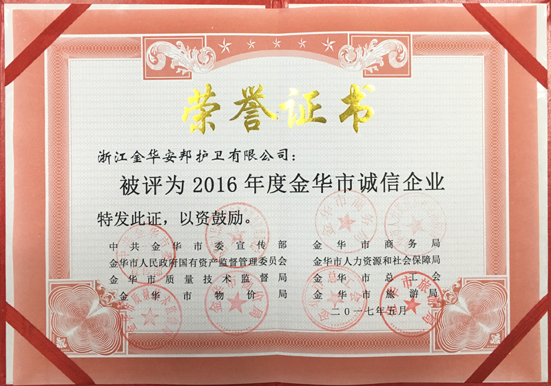喜报:金华安邦被评为2016年度金华市诚信企业(办公室)