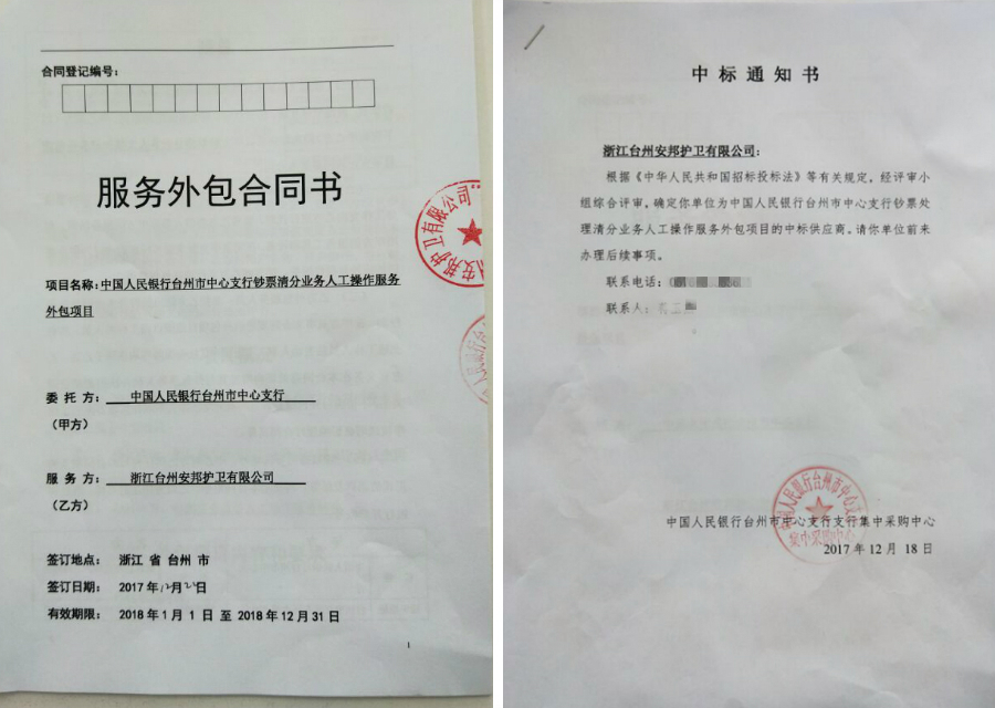2017年12月14日,由中国人民银行台州市中心支行进行《钞票处理清分业务人工操作服务外包项目》竞争性公开招标,经过与多家公司的激烈竞争,我公司成功中标,成为中国人民银行台州市中心支行钞票处理清分业务人工操作服务外包项目的中标供应商。为能成功中标,公司业务发展部认真研究招标文件,领会招标意图,制定了周密的工作计划、事前准备并精心组织实施。最终,凭借公司良好的信誉、行业经验、强大技术实力以及优秀的方案、完善的质量保证体系以及合理的报价,最终赢得了招标单位的肯定,顺利中标。并于12月22日完成《服务外包合同书》签署工作。