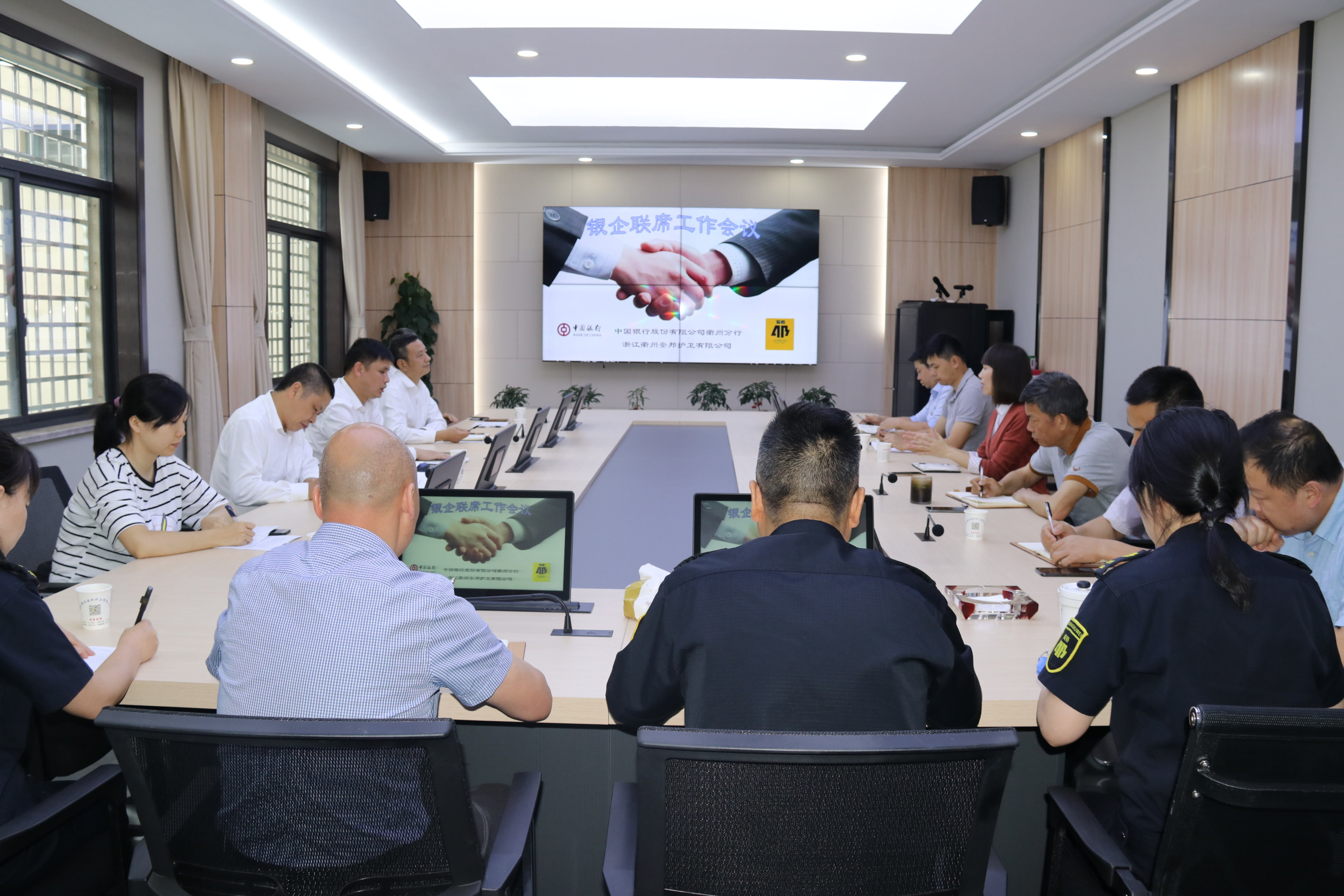 与中国银行衢州分行召开2019年银企联席会议。公司党委书记、总经理张淑芬,党委副书记、纪委书记郭启明,党委委员、副总经理郑胜,党委委员、总经理助理琚苏炳,办公室主任胡翔,中行衢州分行副行长、纪委书记朱文胜,办公室主任郑剑峰等相关部门负责人参加了会议。
