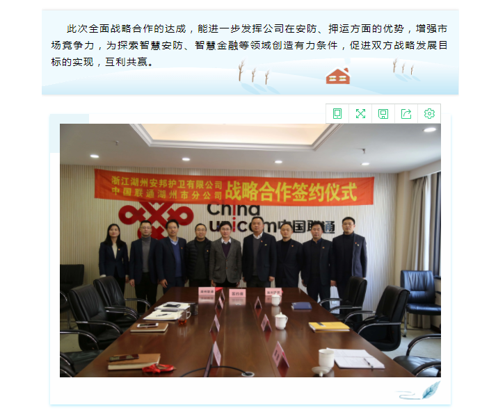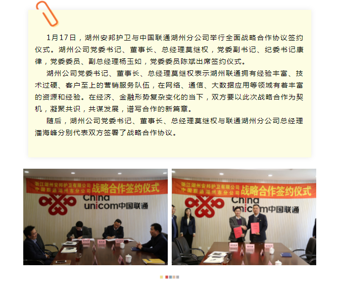 湖州安邦与湖州联通签署全面战略合作协议