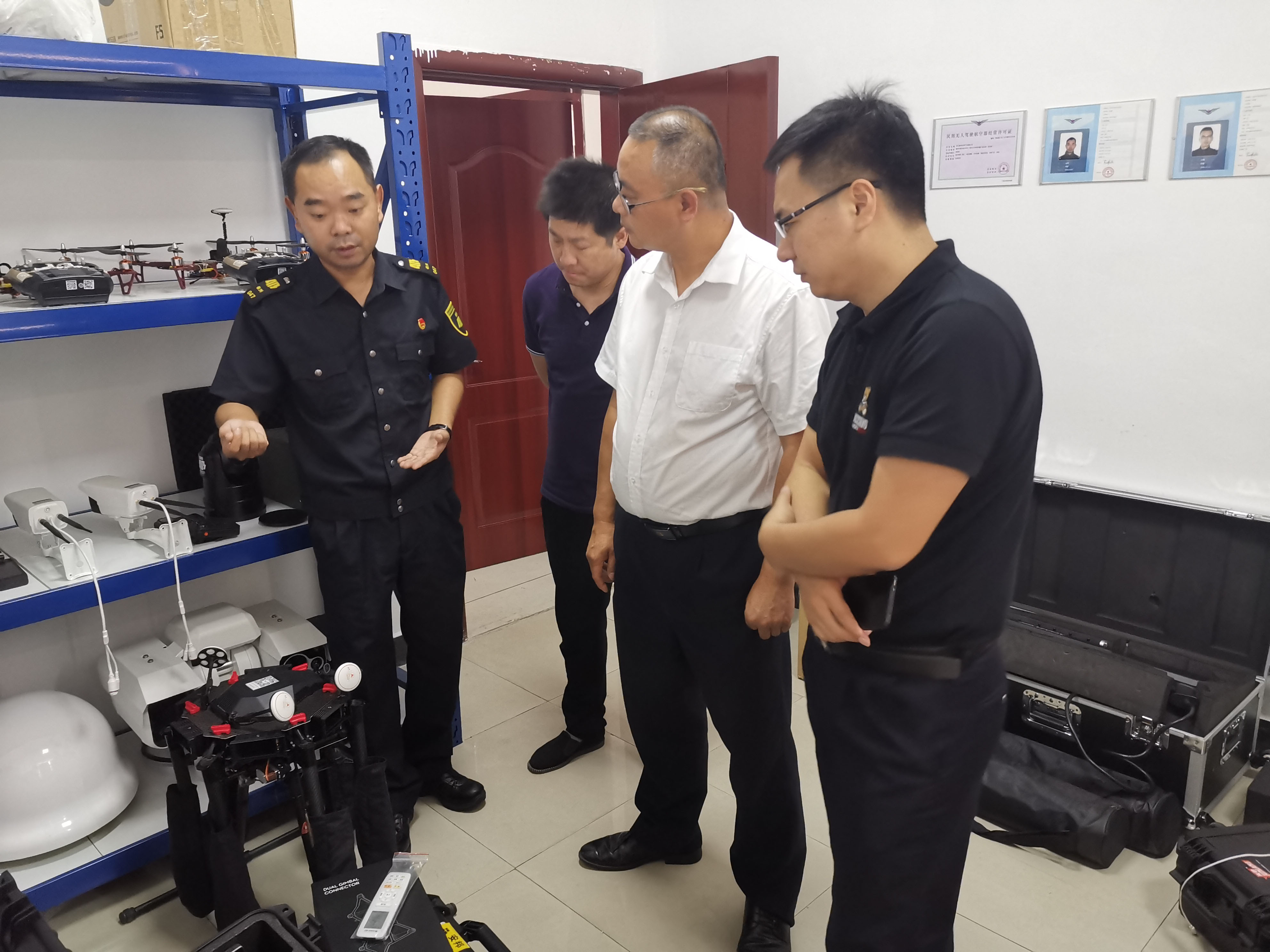 郑胜介绍了科技防护部人员结构、业务范围及经营状况等,徐伟讲解了天鹰飞行队业务开展情况及以配备的装备。
