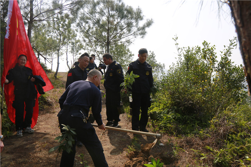 植树现场,鲜红的党旗在风中飘扬,班子带头,5人一小组,大家热情洋溢、干劲十足,纷纷挥锹铲土、定点挖坑、放苗回填、浇水植树,场面异常火热,大家相互协作,配合默契,忙得不亦乐乎。经过3个小时的努力,大家冒着烈日累计种植树苗300余棵,充分发扬了吃苦耐劳,艰苦奋斗的精神。
