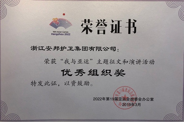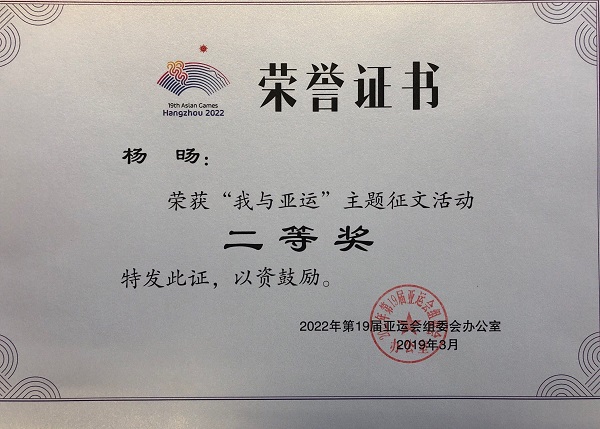 热烈庆贺成人主播 在由2022年第19届亚运组委会、共青团浙江省委、浙江省教育厅举办的“我与亚运”主题征文和演讲活动中荣获优秀组织奖,安全服务公司杨旸荣获“我与亚运”主题征文活动二等奖。