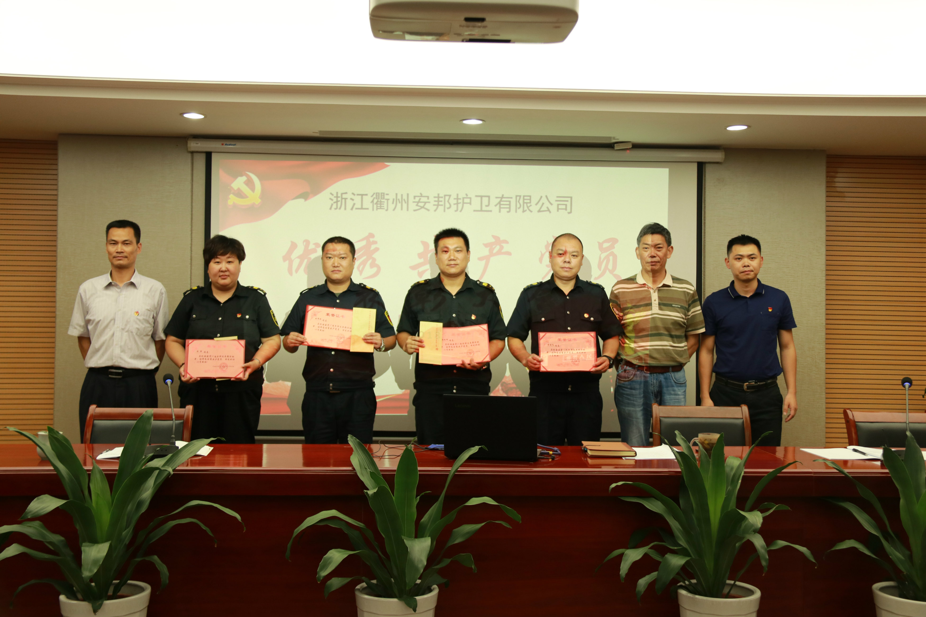 党委委员、总经理助理琚苏炳同志宣读表彰决定,机关党支部周静,守押大队党支部张剑峰、张伟斌,综合管理党支部金国飞4名同志获得“优秀共产党员”荣誉称号。公司党委班子全体成员对受表彰的优秀党员表示祝贺,并颁发了荣誉证书,要求全体干部职工以先进为榜样,发扬共产党员先锋模范作用,立足岗位奉献,勇于担当作为,推动公司各项事业持续发展。