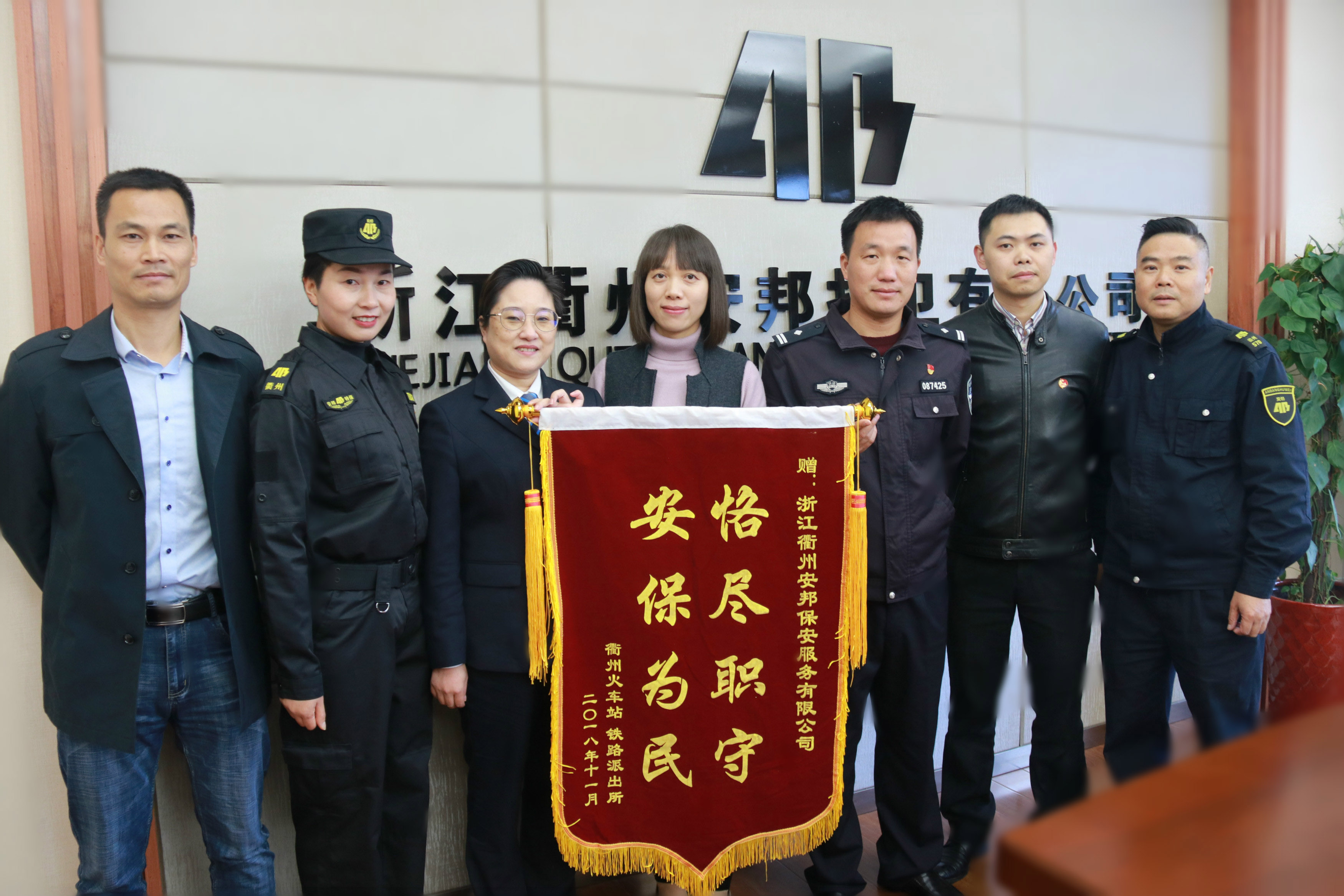 2018年11月13日,衢州火车站戚海强书记、丰美菊副站长,铁路派出所吴国荣副所长一行将一面写着“恪尽职守 安保为民”的锦旗送到浙江衢州安邦保安服务有限公司,对安邦保安优质、高效、热情的服务表示感谢。