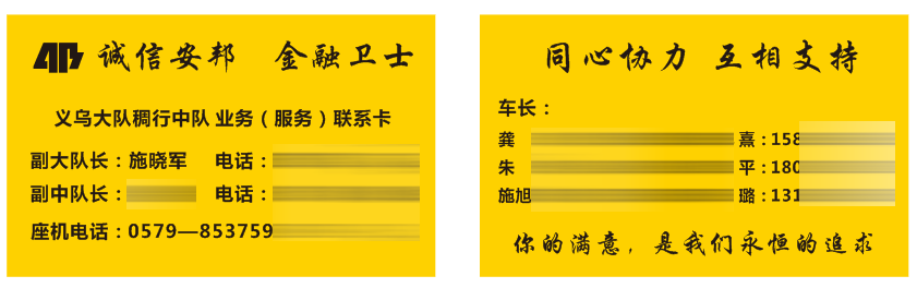 为加强与银行方的沟通、交流,提升安邦整体服务质量,金华安邦公司义乌守押大队副大队长施晓军专门制作了印有中队领导及车长联系方式的业务(服务)联系卡。