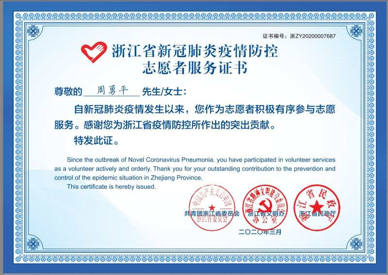 宁波公司周勇平被授予新冠肺炎疫情防控志愿者